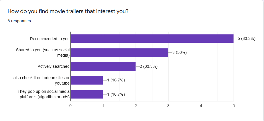 Furthermore, participants indicated that watching trailers influenced their likelihood of going to see a film. Trailers had a persuasive impact, often influencing participants to follow through and watch the complete movie.
