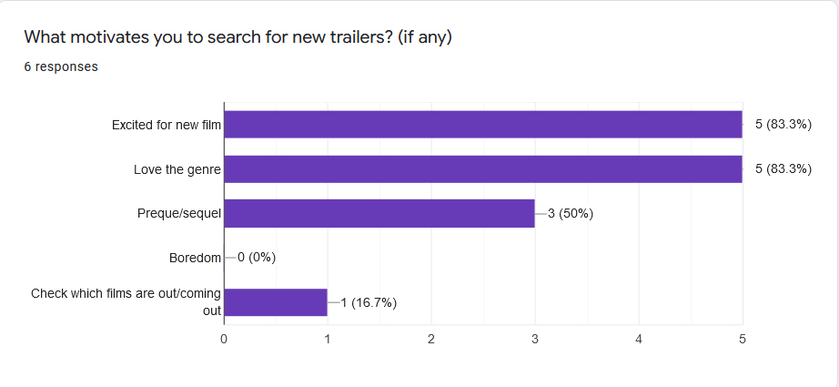 When it came to motivations for seeking out trailers, participants expressed excitement for upcoming films or a particular interest in genres they enjoyed. These factors played a significant role in their decision to explore movie trailers.