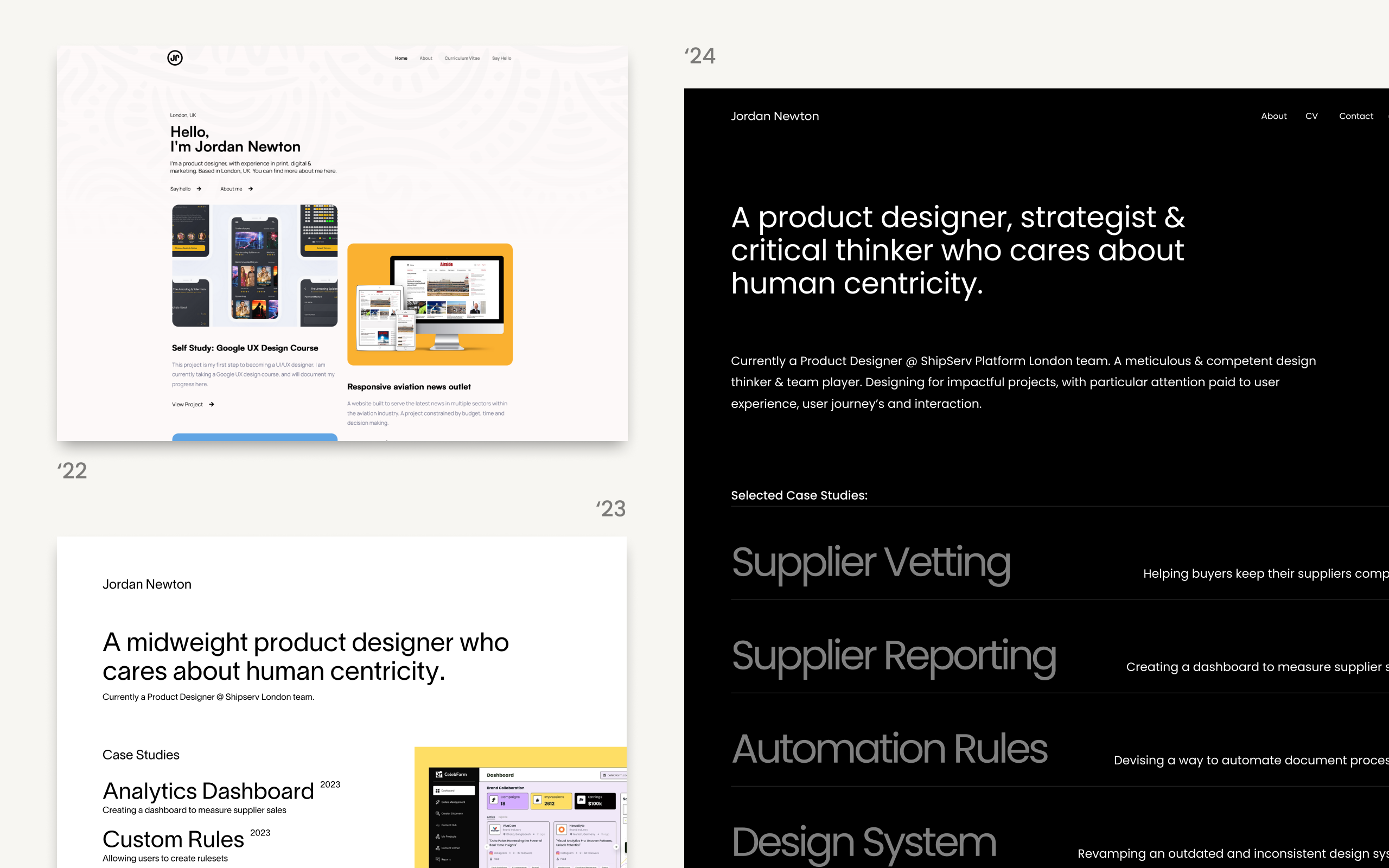 Welcome to my portfolio – I’m Jordan: designer, thinker, and creative. One thing is certain for designers – you will never be absolutely happy with your portfolio. Portfolio ’22 was my first portfolio, with the main aim to break into the industry and land my first job. Well, it happened, and now it’s time to level up my portfolio in line with my experience, while also creating a space that allows me to inject more of my personality – with more written content (like this) and archives of old work.